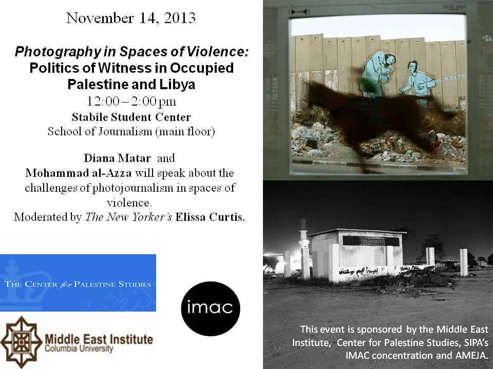 The event is sponsored by the Middle East Institute, Center for Palestine Studies, the Arab and Middle Eastern Journalists' Association and SIPA's (IMAC) International Media, Advocacy and Communications specialization.