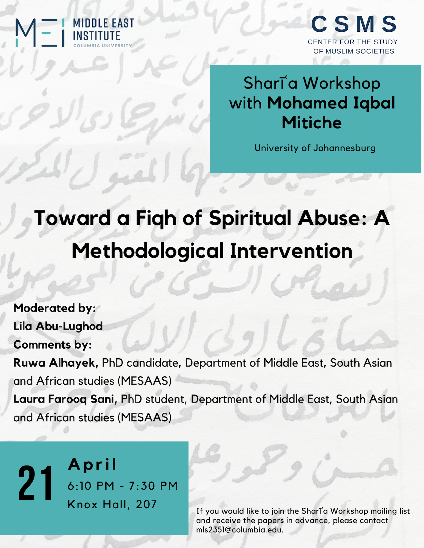 Join the Middle East Institute and the Center for the Study of Muslim Societies for our latest Sharīʿa Workshop with Mohamed Iqbal Mitiche. We will discuss his paper “Toward a Fiqh of Spiritual Abuse: A Methodological Intervention.”
